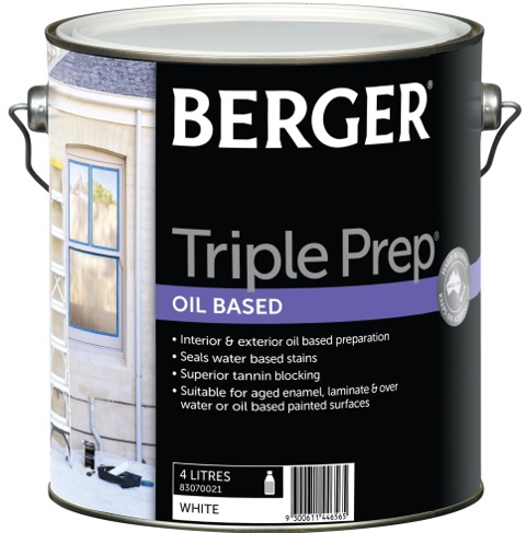 Berger Triple Prep Oil Based is a multipurpose preparation paint for use on interior and exterior surfaces to undercoat, prime and seal a surface. Berger Triple Prep Oil Based is ideal for use over aged enamels, laminates, and over pre-painted surfaces where a water or an oil based paint has been previously used. Berger Triple Prep Oil Based seals in water based stains, and has superior tannin blocking properties to prepare surfaces for painting.